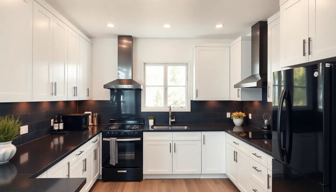 Granite countertops in light shades create a striking contrast with black appliances, elevating the overall style. Quartz options in soft hues maintain a cohesive appearance while being durable and low maintenance. Butcher block countertops introduce warmth and natural elements, pairing well with the sleek finishes of black appliances. Marble offers luxury; subtle veining harmonizes with their modern aesthetic. Laminates in bold colors provide a budget-friendly yet stylish option, enhancing the kitchen’s visual appeal while complementing the black elements.