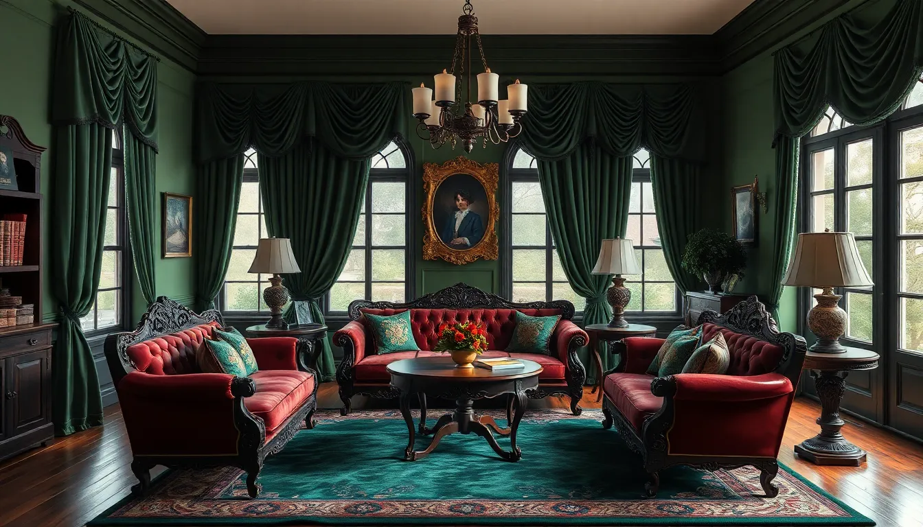 Emphasizing comfort and sophistication, the living room showcases Victorian decor through ornate furniture and rich textiles. Select a tufted sofa in deep burgundy and pair it with patterned throw pillows. Place an intricately carved coffee table in the center, accented by gilded picture frames on the walls. Add layers of heavy drapery that filter natural light while maintaining privacy. Including a crystal chandelier overhead completes the opulent atmosphere, making the living area inviting yet striking.