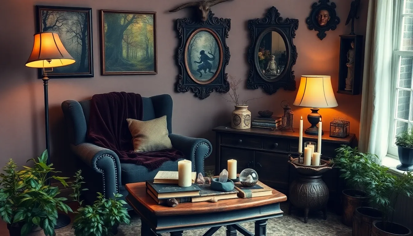 Create a cozy corner with a plush chair draped in darker fabrics. Add a small, vintage table to hold an assortment of spell books, crystals, and candles. Surround the area with potted herbs for an earthy touch. Consider using a velvet throw to enhance comfort while maintaining a witchy aesthetic. Soft lighting, such as a floor lamp with a warm glow, invites relaxation and adds to the mystical vibe.
